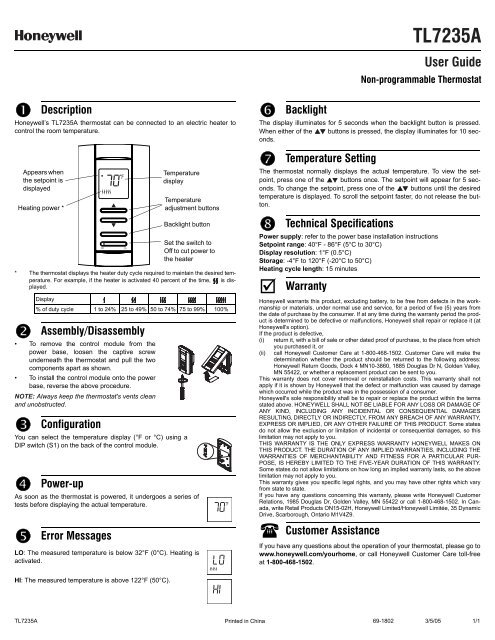 Honeywell Linevoltpro 7000 Digital Non Programmable Electric Heat Thermostat Tl7235a1003 Manual And User Guide Manualsmania